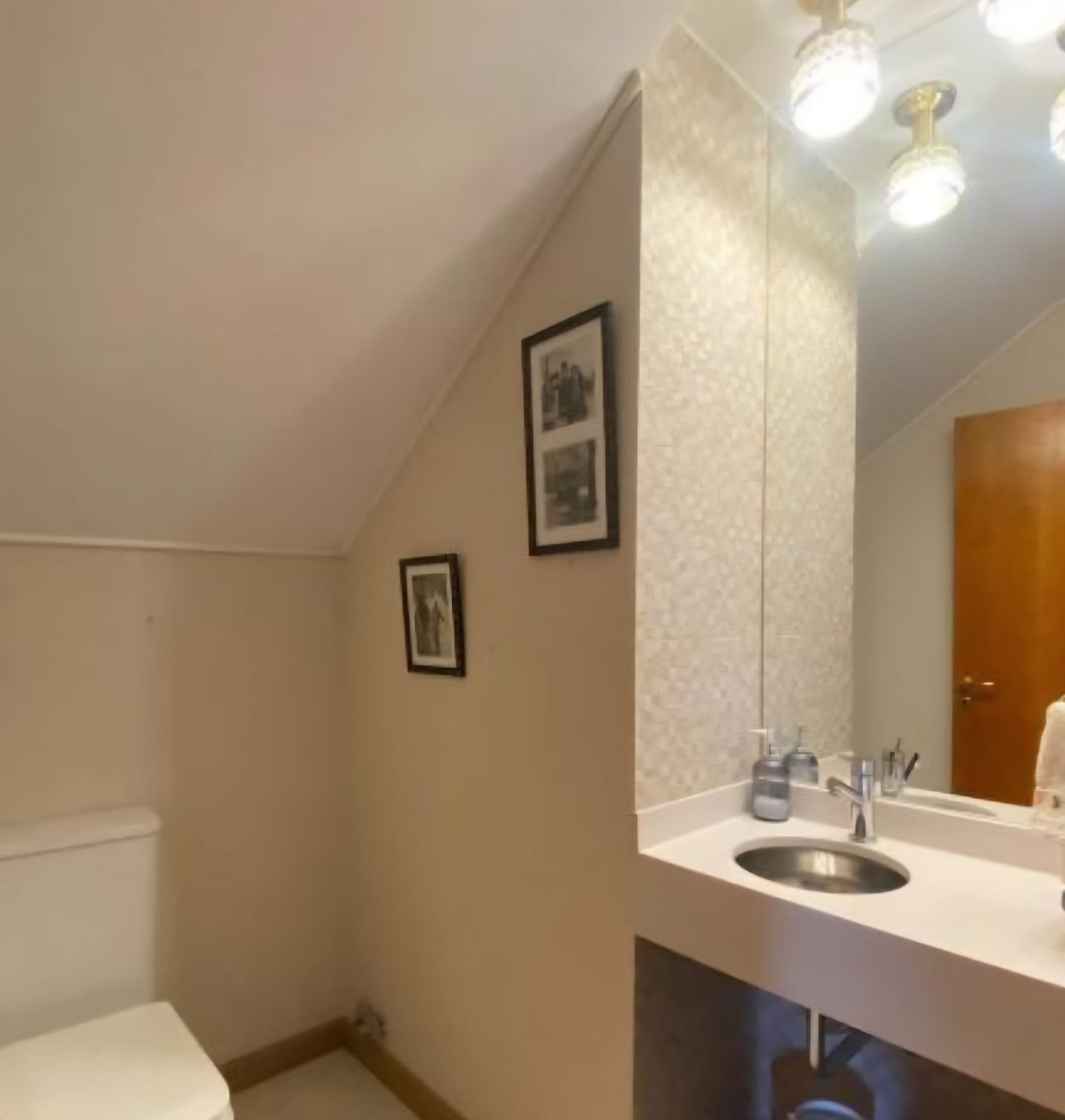 Hall de recepción; Toilette; Living y Comedor Principal con vista al frente y a la Galería Cubierta/Jardin; amplia Suite con vestidor; amplia Cocina con mesadas e isla con Comedor Diario integrado con vista a la Galería Cubierta/Jardin; Galería con cerramiento de hierro y vidrio estilo inglés con parrilla-mesada y bacha, Baño exterior para la pileta y ducha exterior; Lavadero; y Habitación de Servicio con baño independiente con acceso desde la entrada de servicio. La casa tiene un Depósito exterior con puerta al costado de la cochera que tiene el sistema de bombeo de agua al tanque elevado.